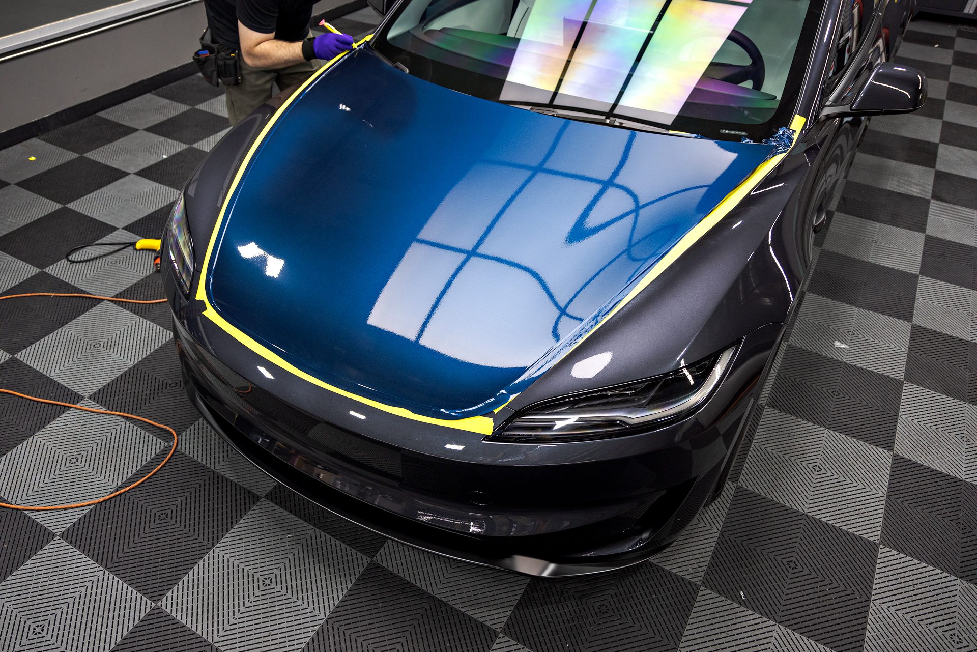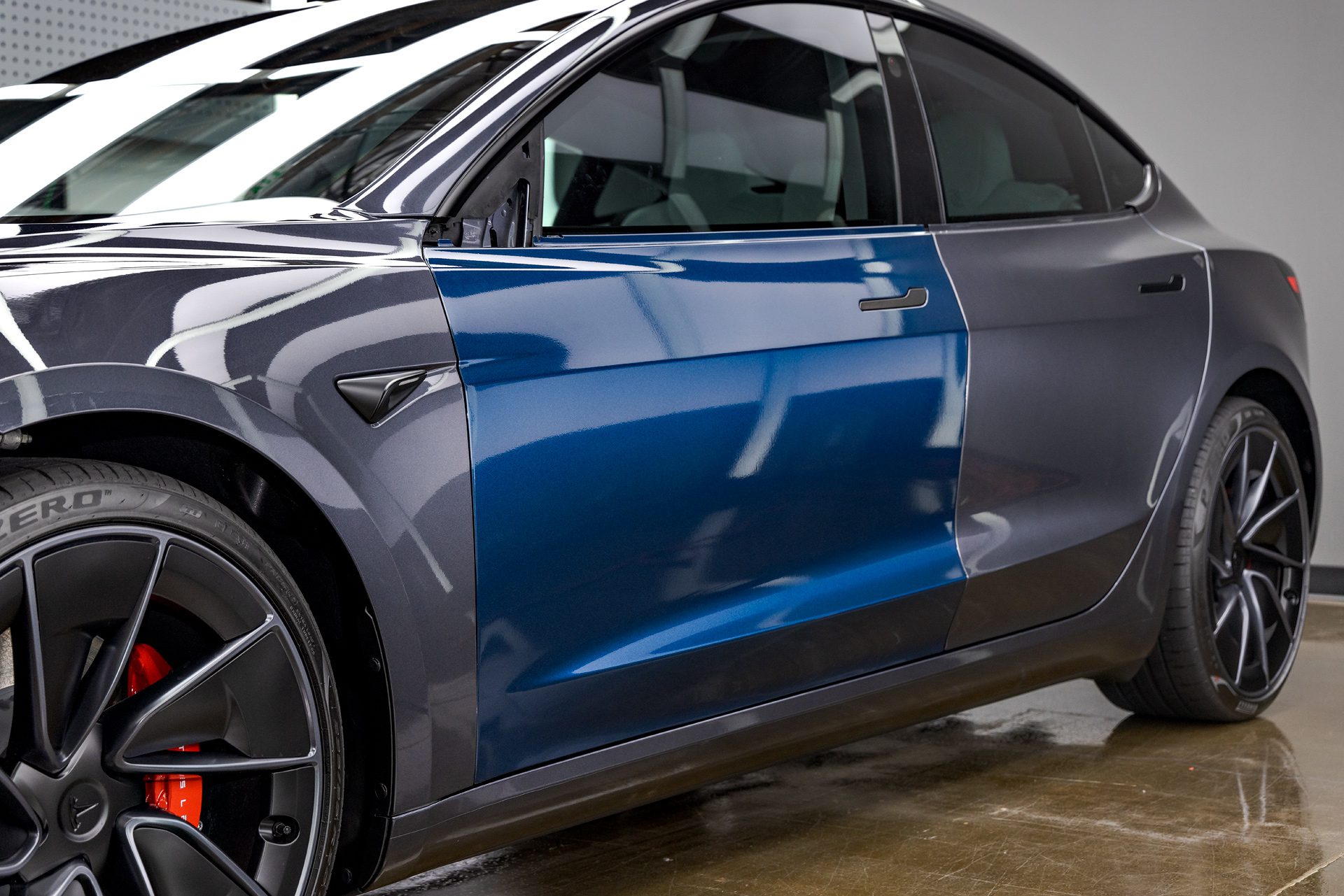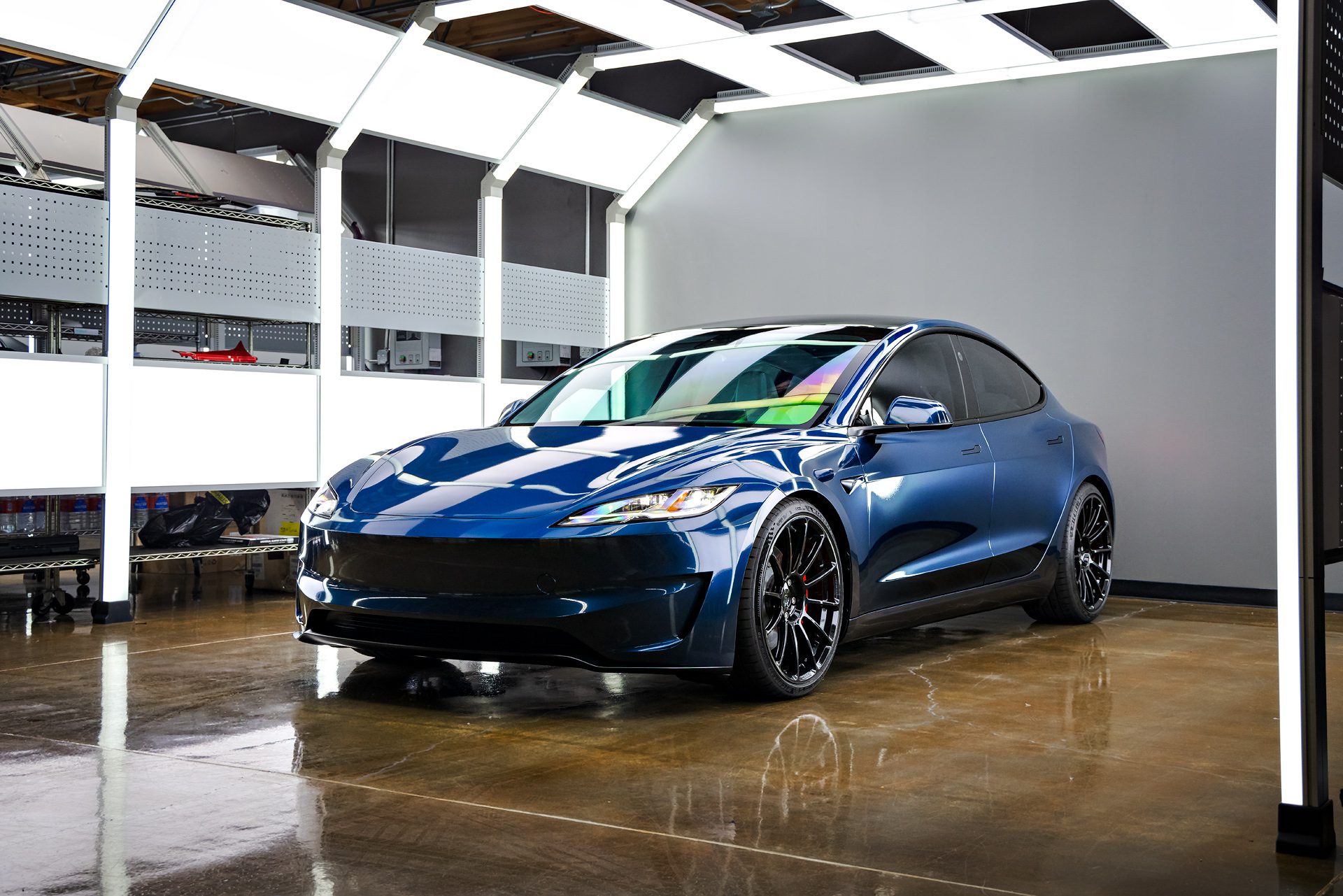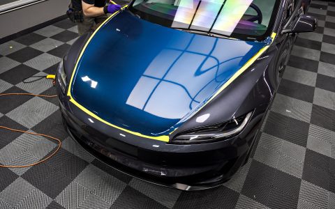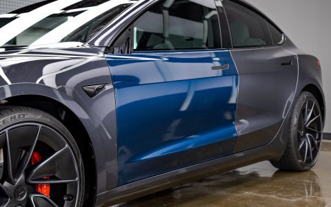 Tesla Highland Model 3 Performance – olor-change vinyl wrap, nano-ceramic window tint, ceramic coating