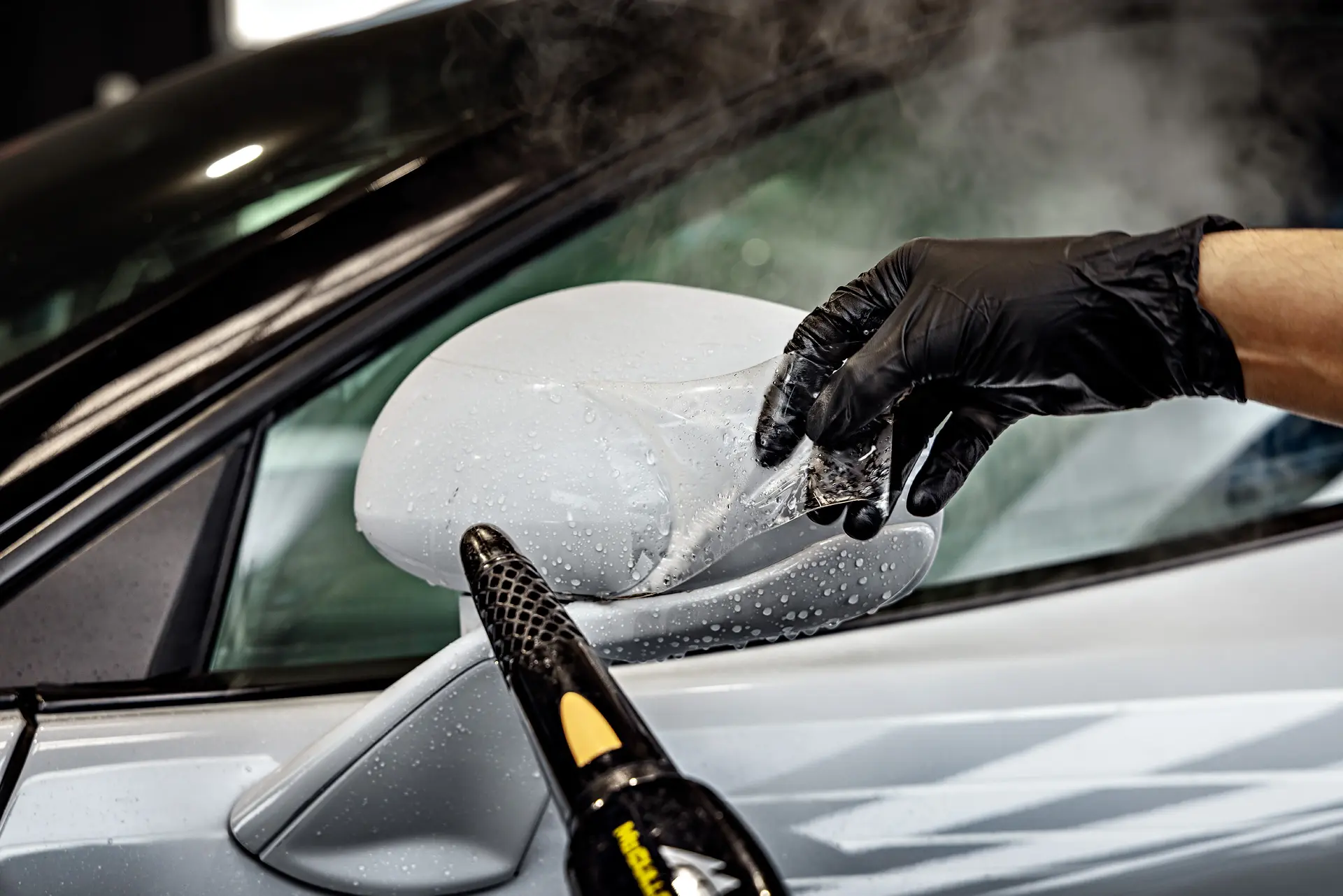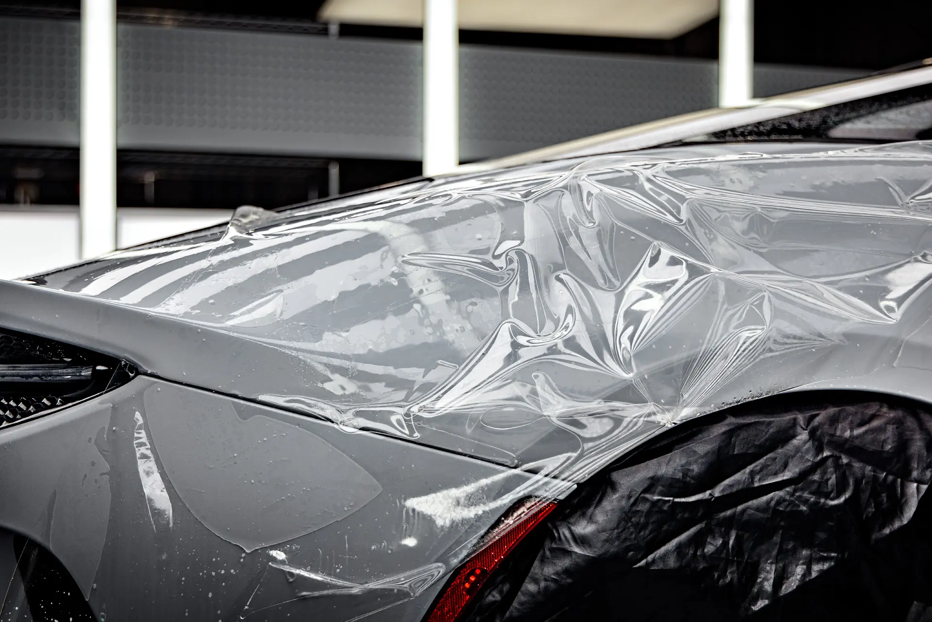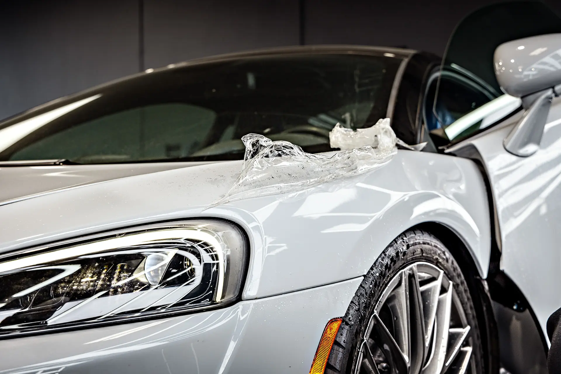 One of the first steps in the McLaren GT’s transformation was the careful removal of old, previously-applied paint protection film from a different shop. This ensures that any imperfections beneath previous layers are corrected before applying new protective films. Following this, the vehicle underwent a full multi-stage paint correction to eliminate swirl marks, scratches, and minor imperfections, restoring the Ice Silver Metallic paint to its original brilliance. High-impact panels, which are more prone to rock chips and damage, received expert paint repair and refinishing to guarantee a flawless finish. After the correction, the GT was fully wrapped in XPEL Ultimate Plus paint protection film (PPF), providing a nearly invisible shield against road debris while maintaining the depth and shine of its factory paint.