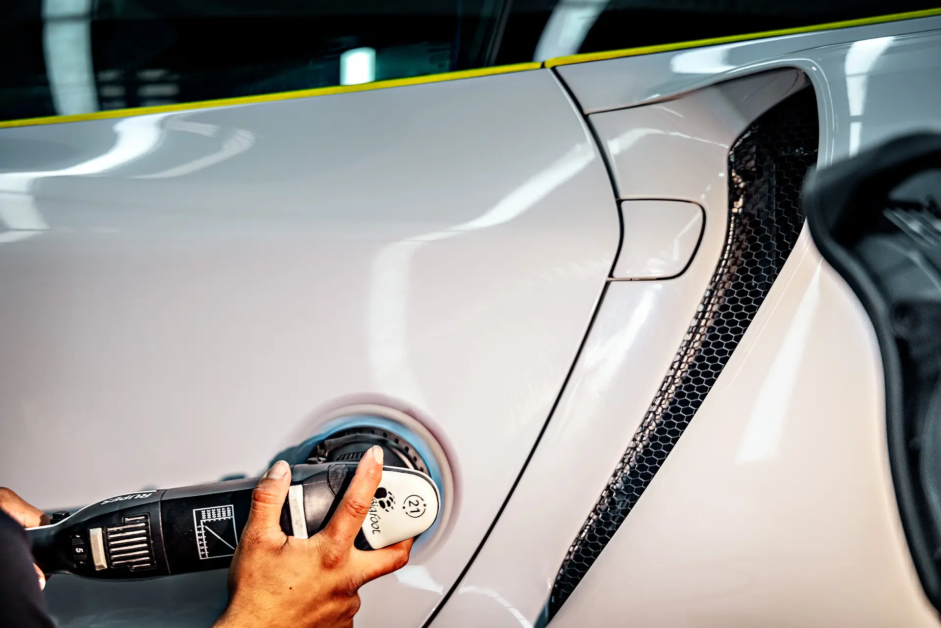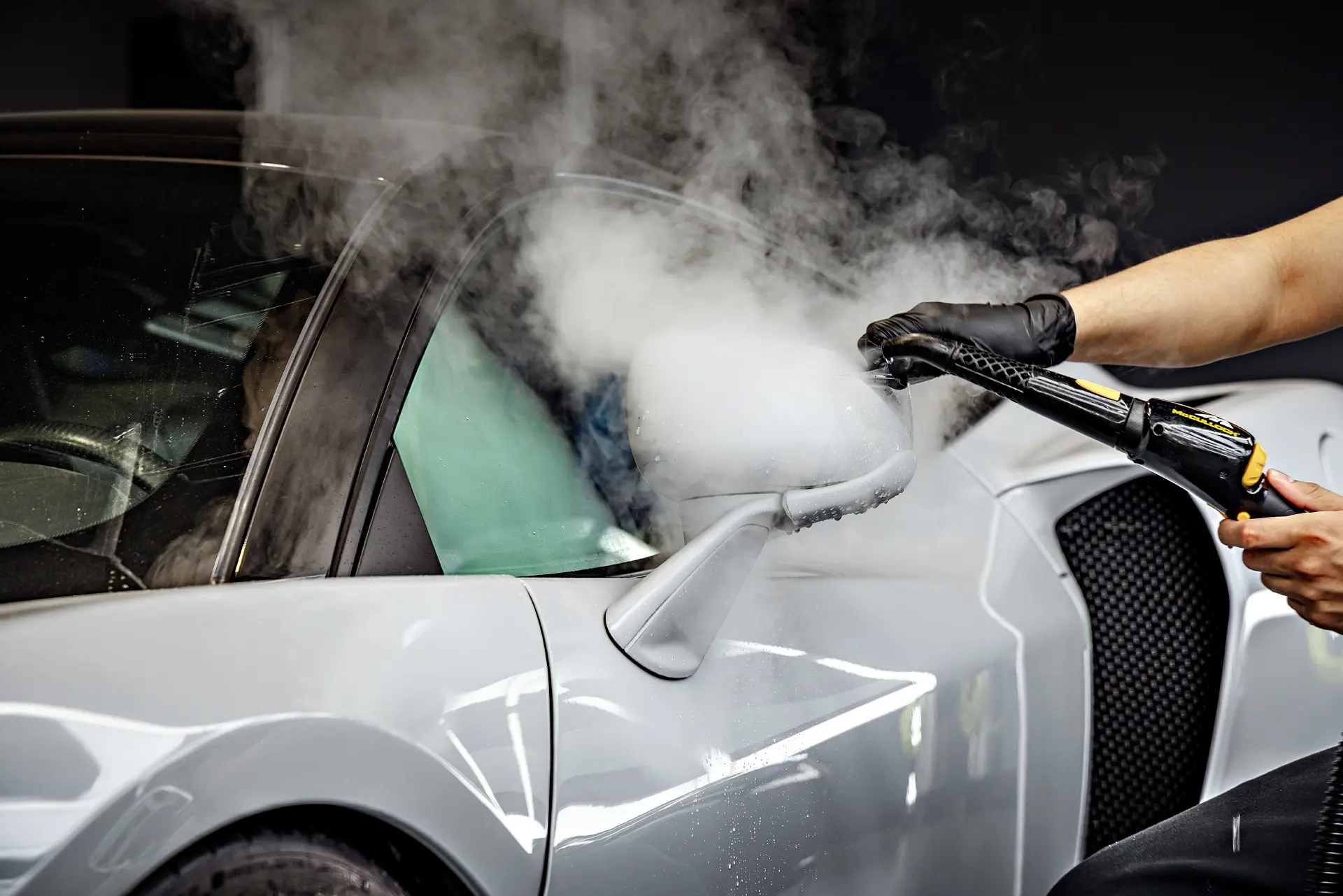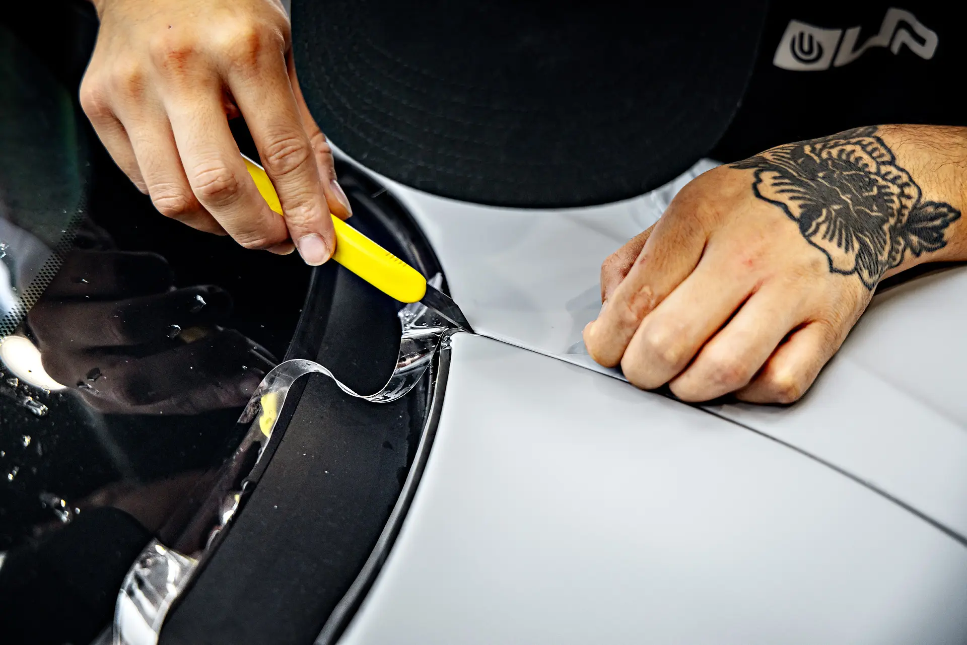 One of the first steps in the McLaren GT’s transformation was the careful removal of old, previously-applied paint protection film from a different shop. This ensures that any imperfections beneath previous layers are corrected before applying new protective films. Following this, the vehicle underwent a full multi-stage paint correction to eliminate swirl marks, scratches, and minor imperfections, restoring the Ice Silver Metallic paint to its original brilliance. High-impact panels, which are more prone to rock chips and damage, received expert paint repair and refinishing to guarantee a flawless finish. After the correction, the GT was fully wrapped in XPEL Ultimate Plus paint protection film (PPF), providing a nearly invisible shield against road debris while maintaining the depth and shine of its factory paint.