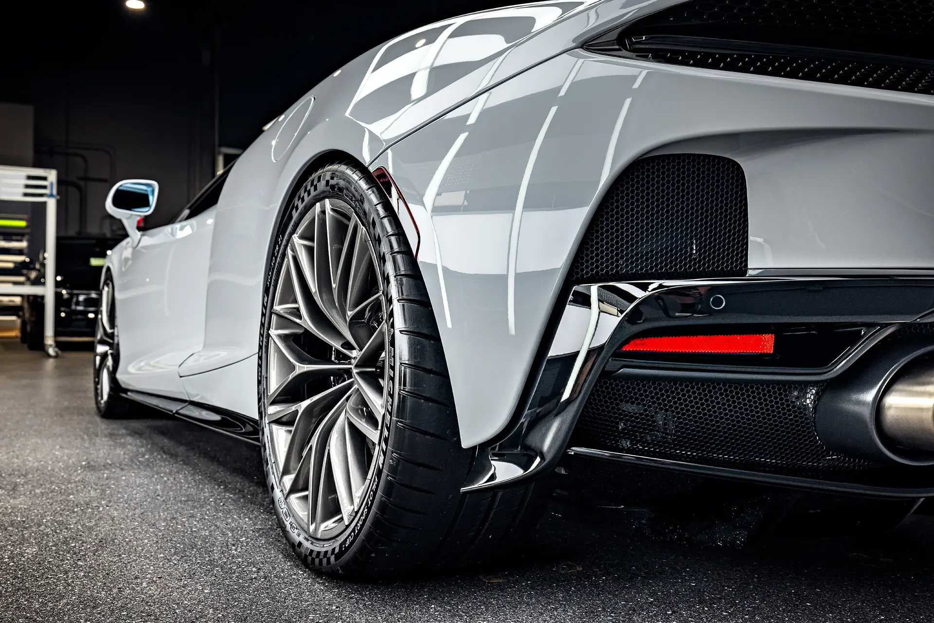 In addition to paint protection, BPAS applied full vehicle XPEL Prime XR Plus nano-ceramic window tint. This not only enhances the McLaren GT’s sleek appearance but also improves interior comfort by reducing heat and UV exposure. The windshield received XPEL exterior protection film, and the bumper reflectors were treated with XPEL Slate Smoke protection film, combining aesthetics with functional durability. To complete the protection package, the GT received a full professional-grade ceramic coating across its body and wheel barrels, including calipers, providing long-lasting gloss, water beading, and resistance against contaminants.